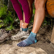 Engineered for women who run and hike fast on uneven trails, the Trail Midweight Mini-Crew toesock delivers comfort, protection, and support. The double-cuffed Mini-Crew height seals out dirt and debris, while COOLMAX® EcoMade fibers wick moisture. Midweight footbed cushioning and arch support ensure comfort on trail runs, while the unique five-toe design minimizes blisters and allows for total foot utilization on narrow trails.