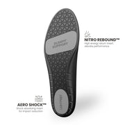 Featuring AERO SHOCK™ IMPACT ABSORPTION technology, our slim fit orthotic insoles ensure superior impact reduction, while the NITRO REBOUND™ foam delivers exceptional energy return. Additionally, the insoles are equipped with anti-odour properties to keep them fresher for longer along with being meticulously crafted to enhance muscle efficiency and reduce joint stress.