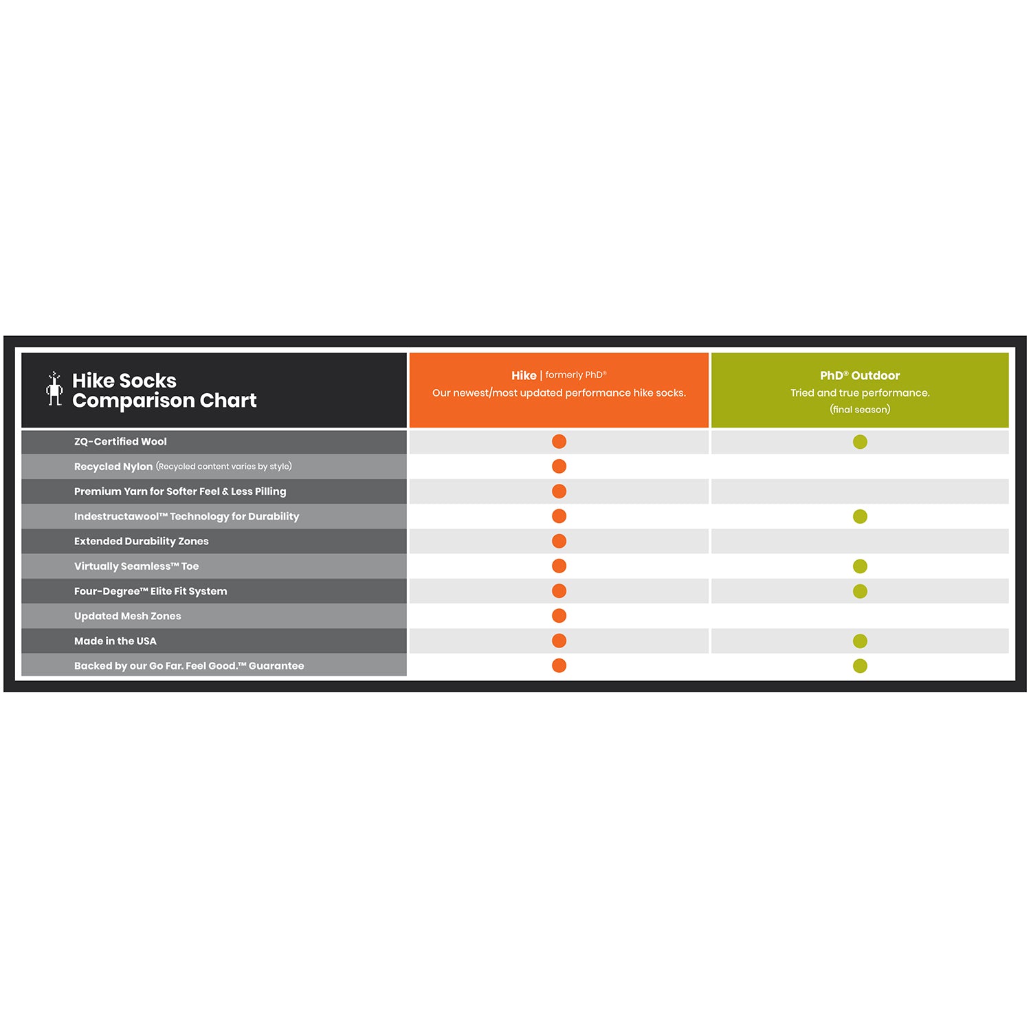 Formerly called PhD® the new Smartwool Hike represents Smartwool’s newest and most up-to-date performance hike socks. With a mid crew height and a comfort welt with “stay put” fit, the Performance Hike Light Cushion Mid Crew shows just enough of its personality above the shoe while protecting all of your comfort inside of it. This sock features Indestructawool™ technology for increased durability, updated mesh zones for less pressure, and a 4 Degree™ elite fit system to match your foot just right. Plus, with the comfort of responsibly sourced Merino wool, these men's wool socks will elevate any hiking experience.